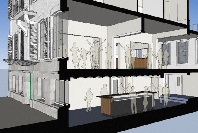 De kerk blijft als bijeenkomstruimte in gebruik door een nieuwe vloer boven de tombes te plaatsen. Op de verdieping kunnen de activiteiten van een begrafenisondernemer plaatsvinden maar ook kan de ruimte als zaal voor -zij het gepaste- muziekvoorstellingen, herdenkingen of buurtbijeenkomsten benut worden.